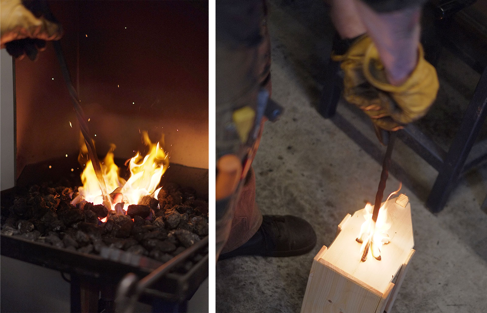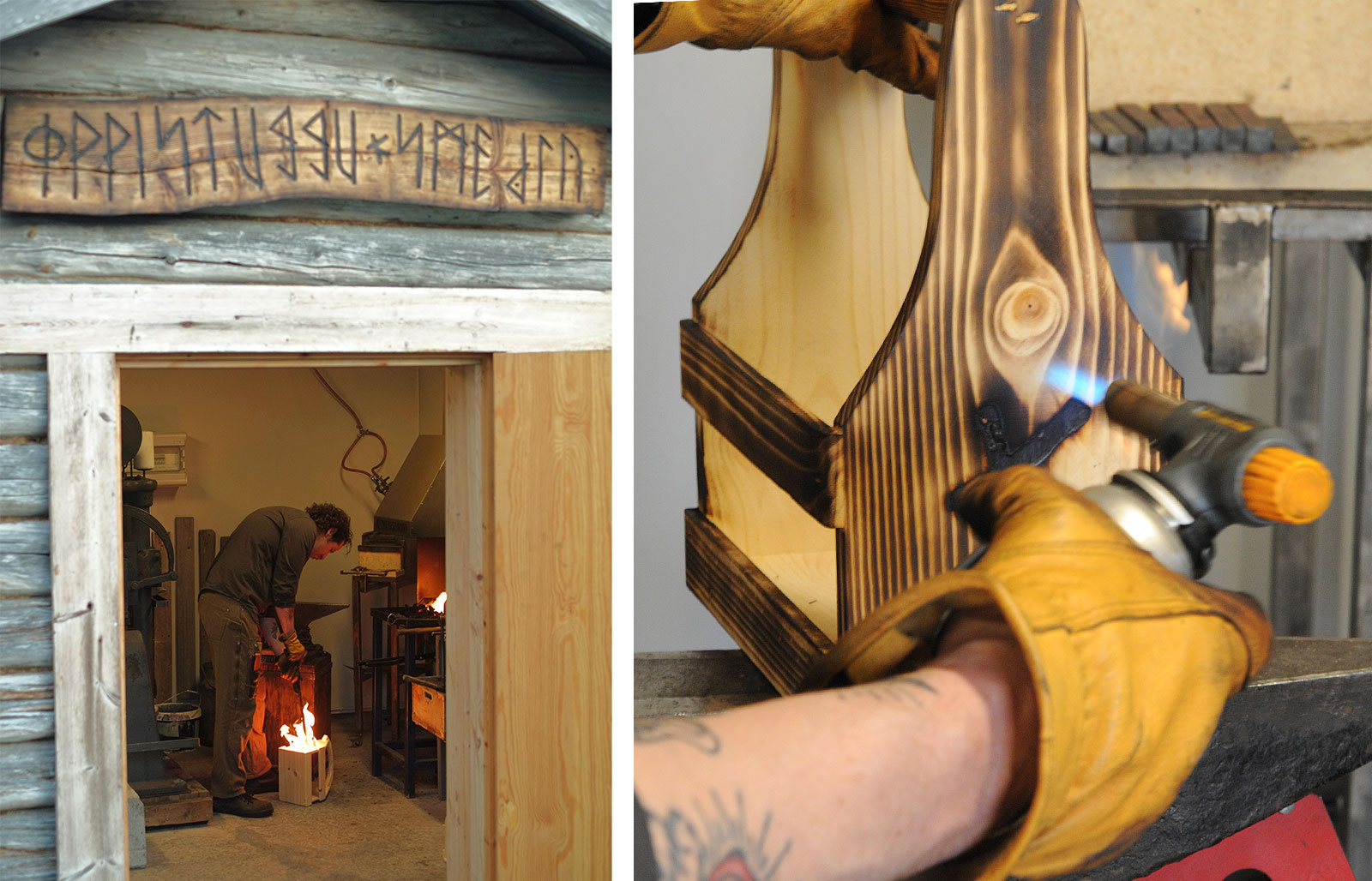 Branding the handmade beer crates with the logo for the Oppistuggu farm using a fire fork.