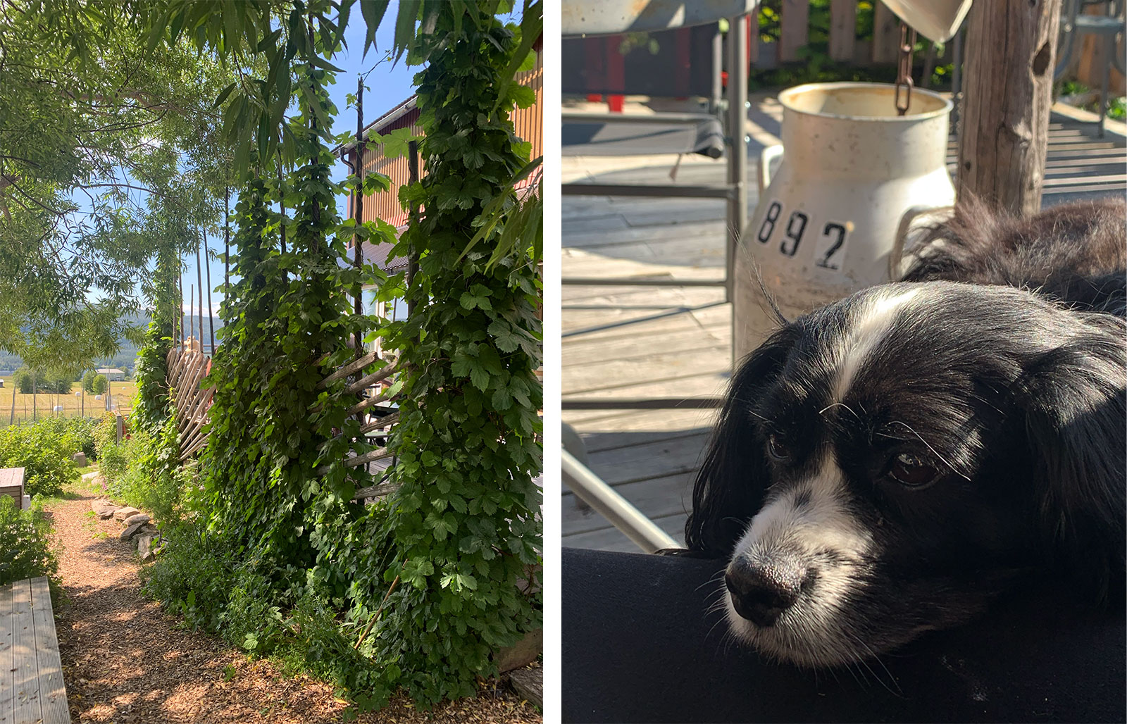 Hops growing at Restaurang Humlelirets outdoor dining area guarded by the brewery dog.