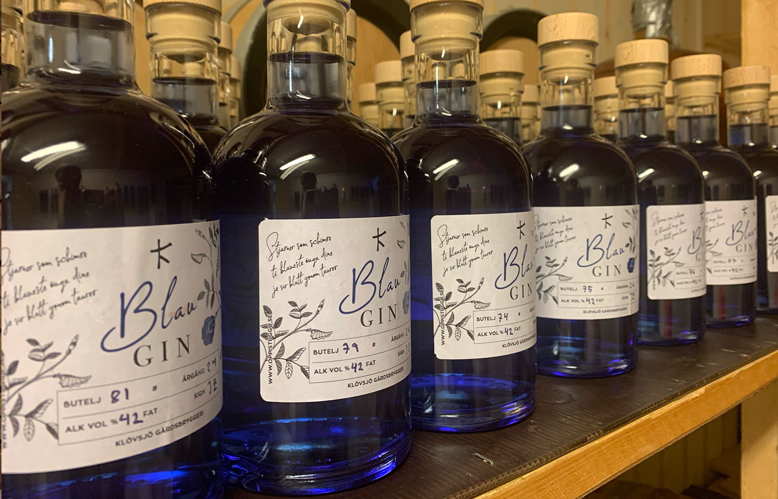 Blau Gin by Klövsjö Gårdsbryggeri, with their secret recipe including the natural ingredient Butterfly Pea Flower to ad a sweet aroma and a rich blue hue.
